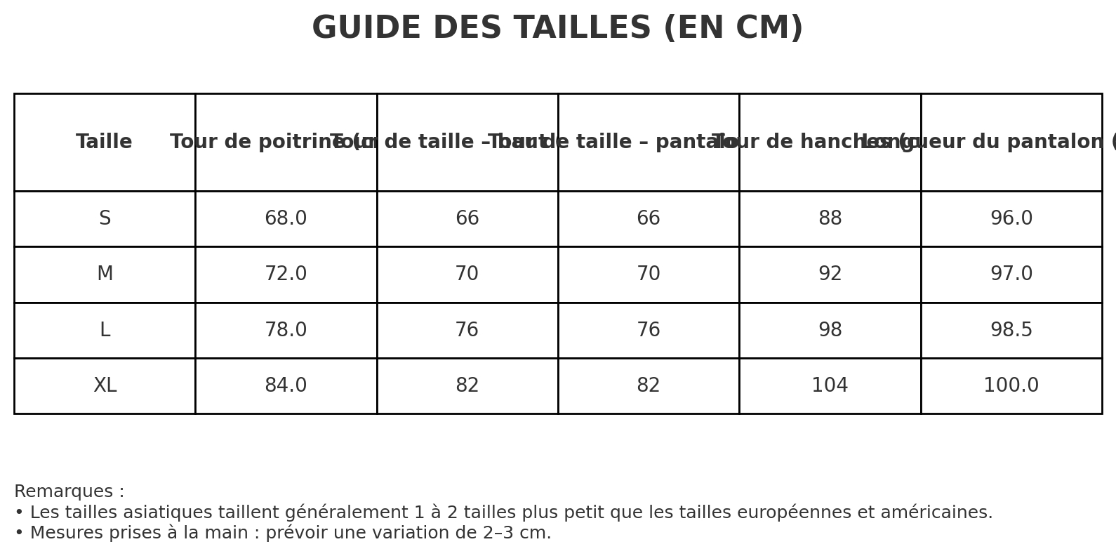 - Les tailles asiatiques sont généralement 1 à 2 tailles plus petites que les tailles européennes et américaines. Si vous hésitez entre deux tailles, choisissez la plus grande.
